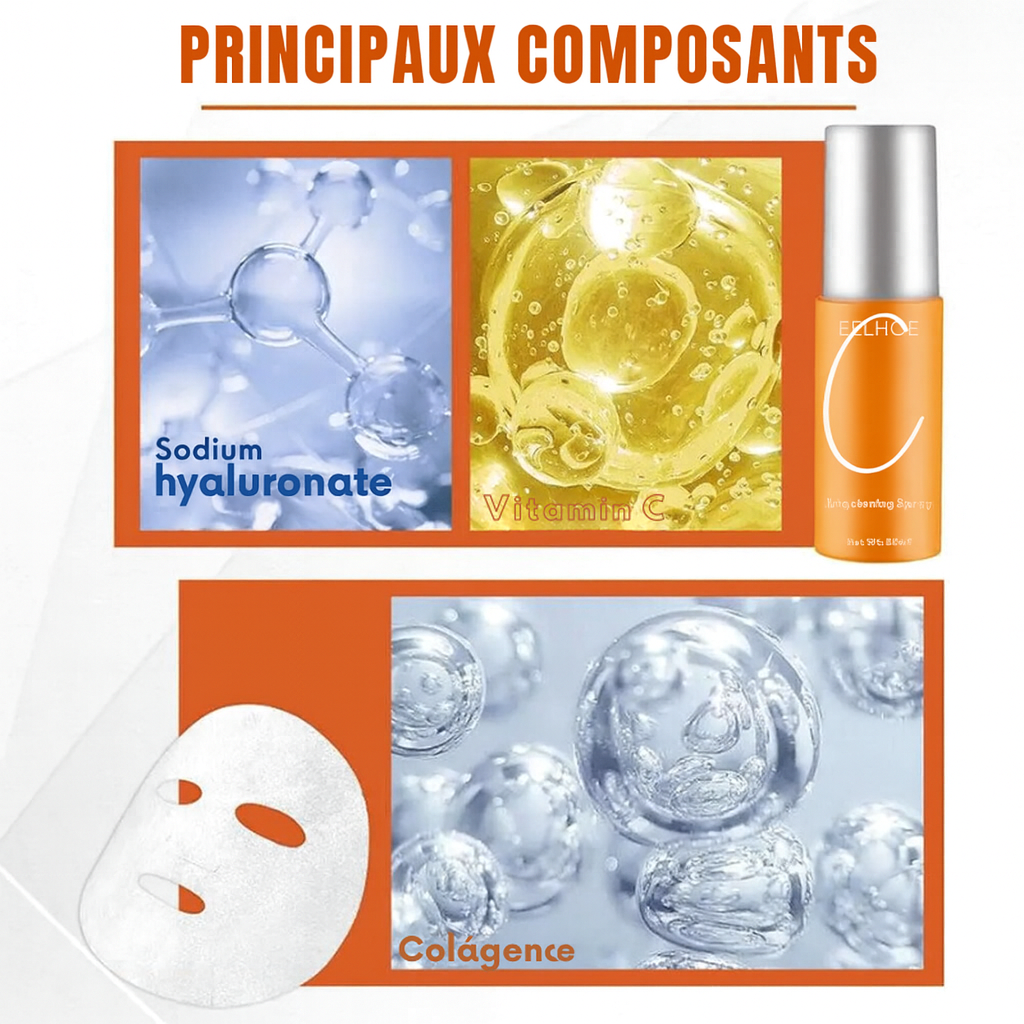 Ingrédients principaux : Hyaluronate de sodium + Vitamine C (Spray) ; Collagène (Masque facial)